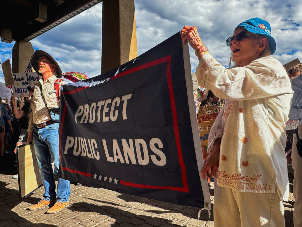 Protesters take part in a demonstration against the proposed sale of public lands as part of U.S. President Donald Trump's tax and spending bill, outside a hotel where U.S. Interior Secretary Doug Burgum spoke at a meeting of western U.S. governors, in Santa Fe, New Mexico, U.S., June 23, 2025. REUTERS/Andrew Hay